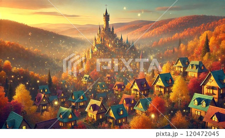 秋色に包まれた魔法の城と村、光が輝く幻想的な風景