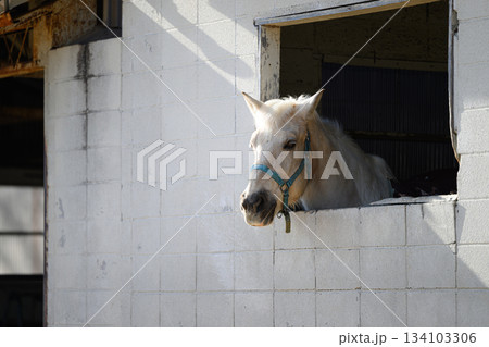 窓から顔を覗かせる白馬 南ヶ丘牧場