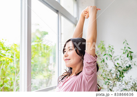 窓際に立って朝の光を浴びる気分爽快な女性