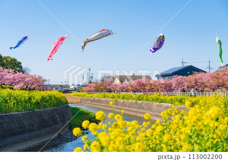 春の免々田川、満開の河津桜と菜の花とこいのぼり〈愛知県田原市〉