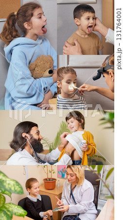 Pediatric medical examination of children in doctor office. Collage of 4 models