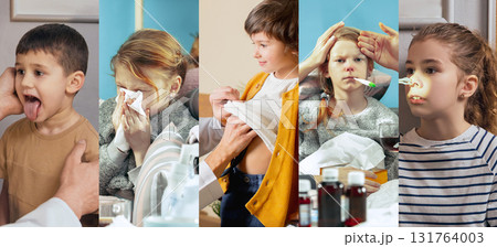 Creative collage. Sick children receiving treatment and diagnosis from doctor at home