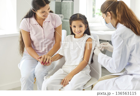 Doctor administering vaccine to school-age girl as supportive mother holds her hand