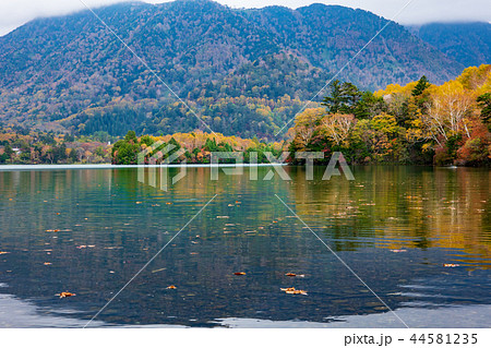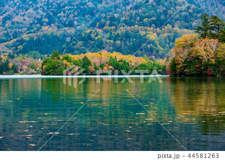 奥日光 湯ノ湖湖畔の紅葉 h-1 兎島と金精峠の山