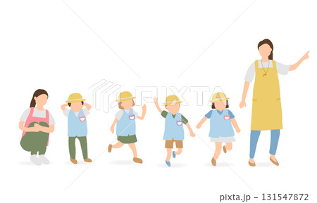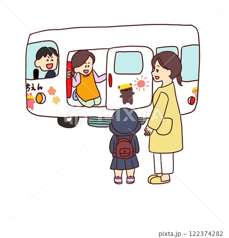 送迎バスに乗り込む園児たちと保育士・幼稚園の先生|保育・幼稚園イラストシリーズ