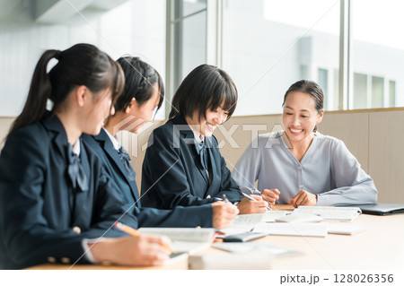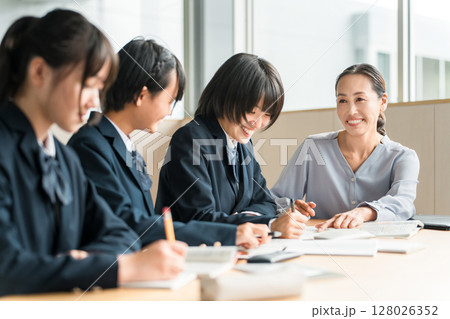 学校の授業・塾で先生・講師・教師から指導を受ける中学生・高校生・女子高生