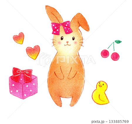可愛いうさぎの手描きイラスト 女の子 リボン 赤ちゃん 子供向け パステル 色鉛筆 水彩風
