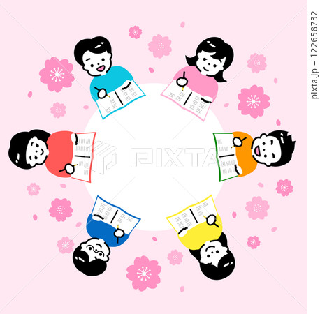 春らしい新学期・入学・塾イメージの小学生の子供が勉強するタイトル向き円形コピースペースのあるイラスト
