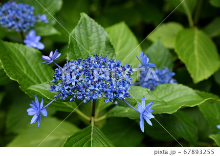 紫のアジサイ 緑の中のアジサイ