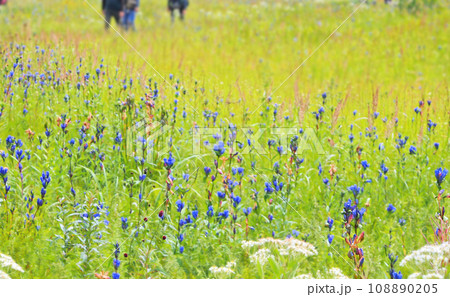 エゾリンドウ咲く草原を歩く人々
