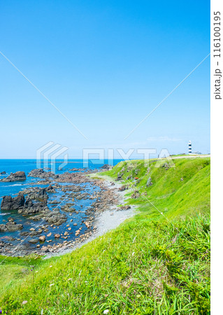 東北・秋田・入道崎の風景・なまはげのいる男鹿半島・灯台周辺の草原と広大な海(2)