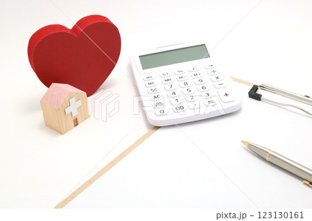 医療費と健康のイメージ ハートと電卓と病院のミニチュア