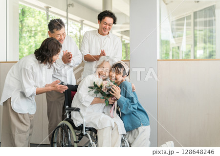 介護施設にお見舞いに来た三世代家族(プレゼント,花束,敬老の日)