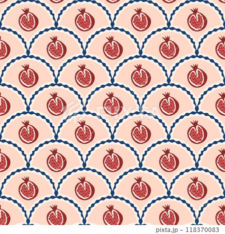Half pomegranates scallop seamless pattern. Fruit arch repeat background. Traditional retro endless design. Vector hand drawn illustration.