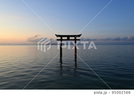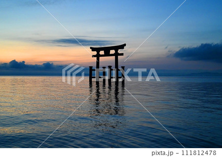 夜明けの滋賀県白鬚神社の湖中に建つ大鳥居が美しい