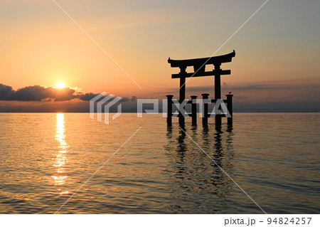 夜明けの琵琶湖に立つ滋賀県白鬚神社の鳥居