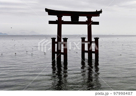 琵琶湖中に建つ幻想的な白鬚神社の大鳥居