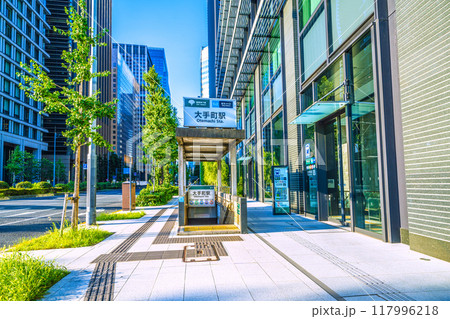 日本の東京都市景観 みずほ丸の内タワー(銀行会館)前の大手町駅出入口D4などを望む=6月22日