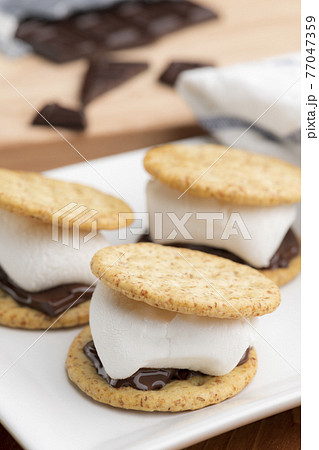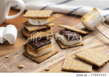 焼いたマシュマロとチョコレートをクラッカーに挟んだスモア