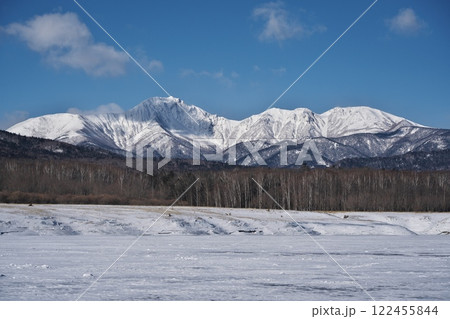 全面凍結した糠平湖から雪山を望む