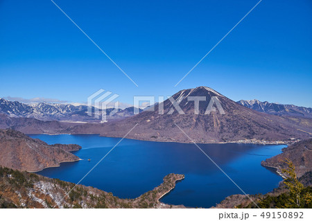 日光 半月山展望台から見た残雪の男体山と八丁出島、中禅寺湖