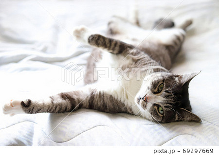 ベッドでぐで~と仰向けに寝る白とグレーのサバトラ猫 靴下ニャンコ
