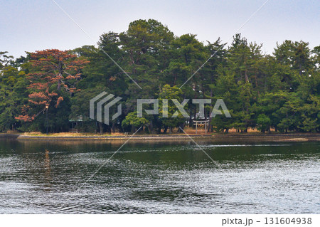 天橋立観光船から見た天橋立と天橋立神社(橋立明神)の鳥居(京都府宮津市)