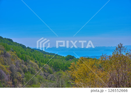 新緑の福島県磐梯町の磐梯山ゴールドライン(滑滝展望台)から南側の眺望(猪苗代湖,湖の周囲の山々)