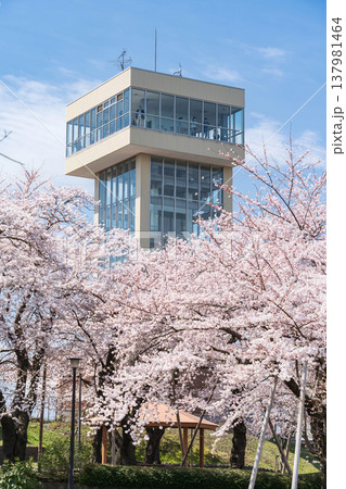 満開の桜とグレットタワーみなと(青森県八戸市)