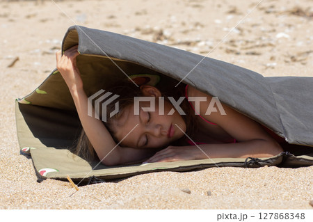 Caucasian child of 8 9 years with closed eyes lying on mat and hiding from sunlight covering by other side of mat on sand beach