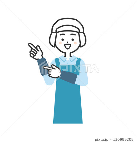 両手で指さす衛生帽をかぶってエプロンを付けた女性イラスト