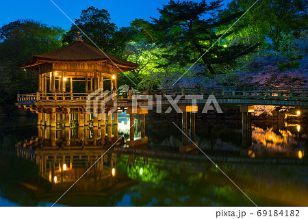浮見堂と鷺池のライトアップ夜景 春 (奈良県奈良市 奈良公園)