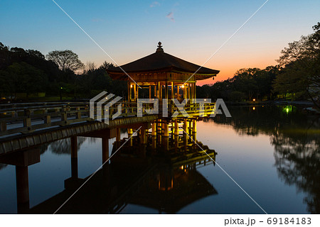 浮見堂と鷺池の夕焼け風景 (奈良県奈良市 奈良公園)