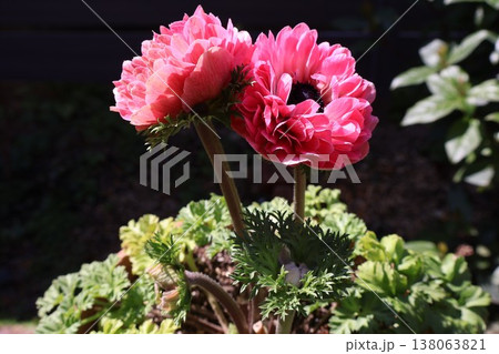 春の陽ざしを浴びた紫色の八重咲きアネモネ