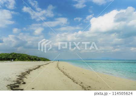 沖縄県竹富島まぶしい砂浜、青い空、透き通る緑の海