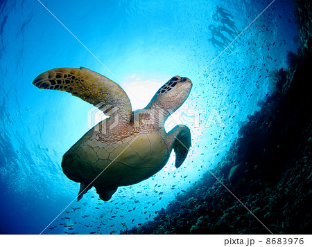 熱帯魚が群れる珊瑚礁を泳ぐ海亀