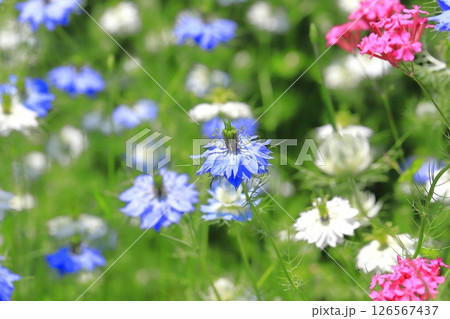ブルーと白のニゲラとピンクのムシトリナデシコ