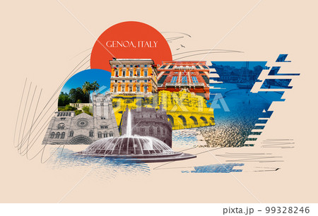 Collage or art design of facades of Italian buildings in old part of town Genoa, Italy.