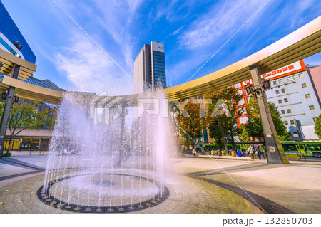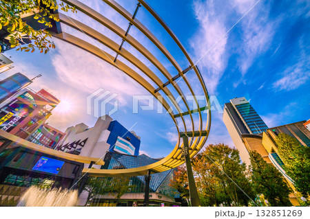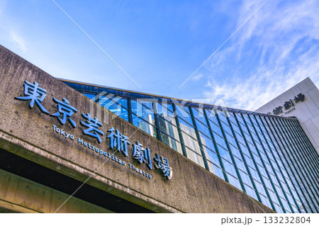 日本の東京都市景観 新風景。池袋駅前の池袋西口公園・東京芸術劇場やガラス窓に映る超高層ビルなどを望む