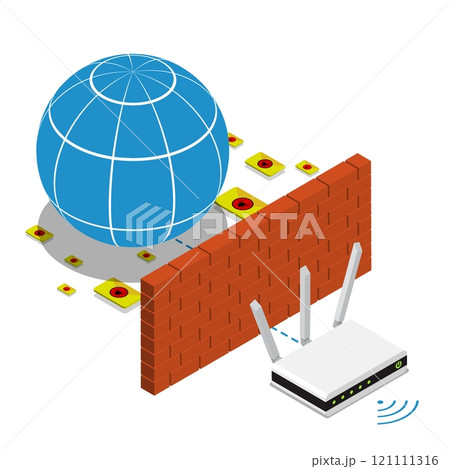 Isometric wireless WiFi router device protected by software firewall. Global network telecommunications security. 3D vector isolated on white background top view at an angle