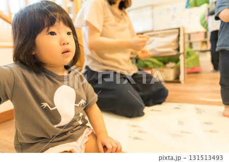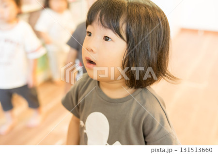 保育園で先生の話を聞く女の子の幼児