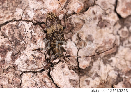 生き物 昆虫 ガロアケシカミキリ、初夏から夏に見られます。地味な体は広葉樹の樹皮に似せている?