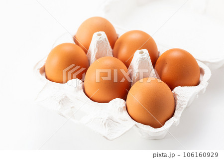 六個入り透明プラスチックケースに入った白い鶏卵六個、麻布背景