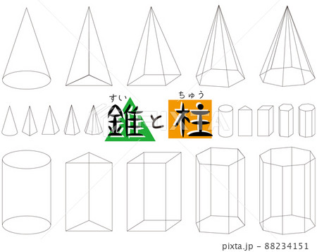 錐と柱の線画 円錐 円柱 四角錐 四角柱 三角錐 三角柱 六角錐 六角柱 八角錐 八角柱