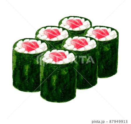 鉄火巻き六貫セット 日本料理の手描き水彩イラスト素材