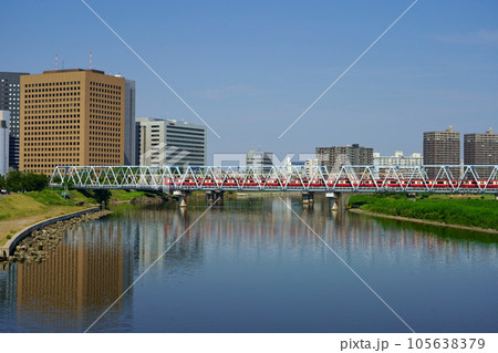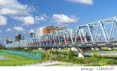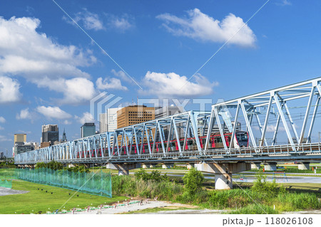 多摩川を渡る電車と川崎駅前のビル群の風景【神奈川県・川崎市-東京都・大田区】