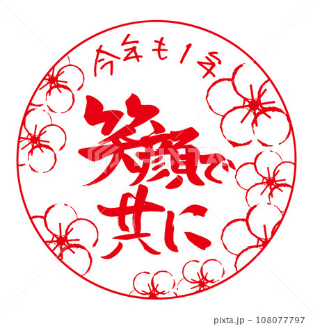 筆文字 今年も1年笑顔で共に(印風 梅の花の墨絵)丸枠 .n