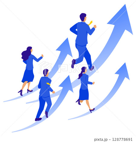 右肩上がりの矢印を走るビジネスチームのイラスト