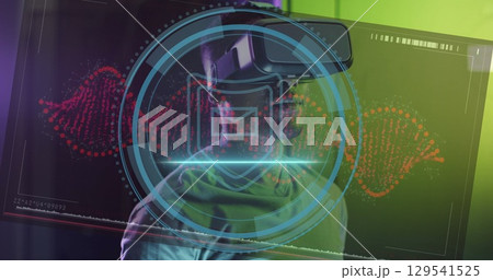 Image of scientific data over caucasian man wearing vr headset in office