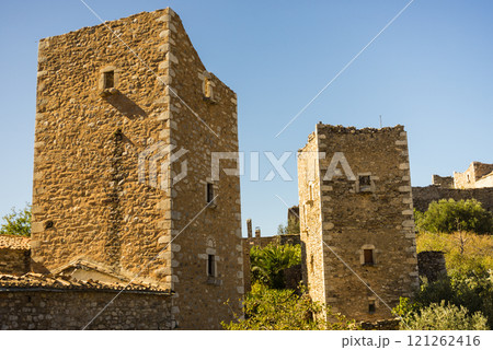 Stone towers and walls of old medieval fortifications on the Island of Rhodes.